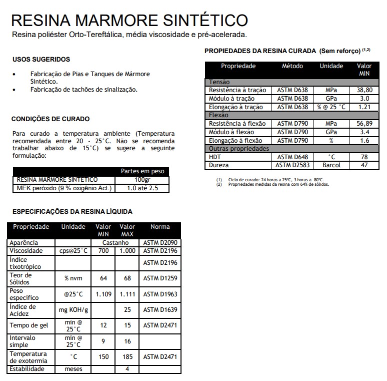 Resina Marmore Sintético Resina poliéster Orto-Tereftálica, média viscosidade e pré-acelerada.Usos sugeridos:– Fabricação de Pias e Tanques de Mármore Sintético.– Fabricação de tachões de sinalização. Clique na imagem para baixar o PDF